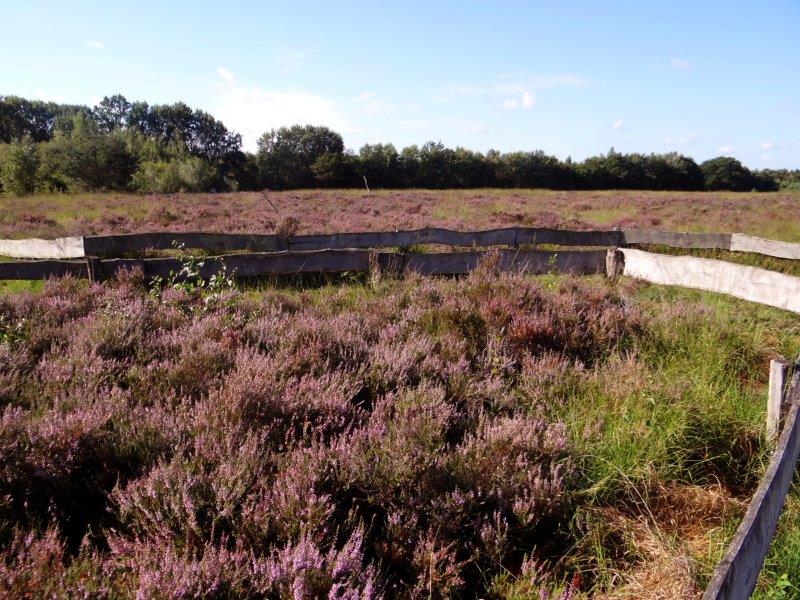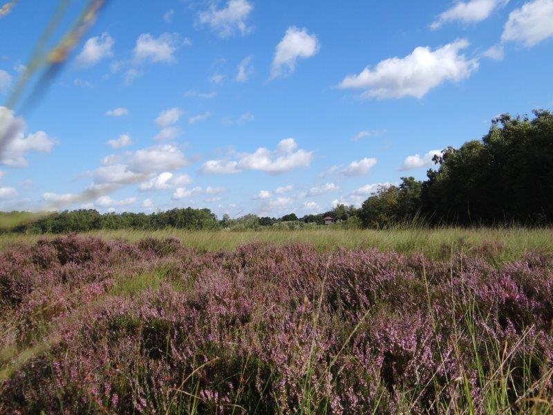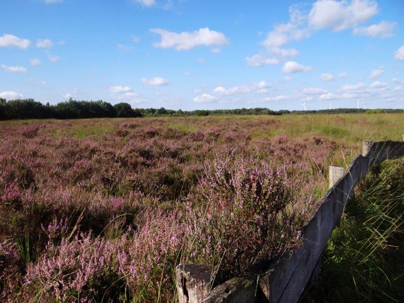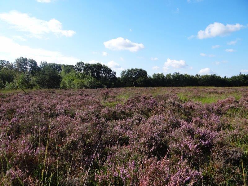Trotzdem sind wir auf der falschen Fährte: Es geht bei der Überschrift nämlich um die jedes Jahr wiederkehrende Heideblüte im Emsdettener Venn. Direkt am Lehrpfad lässt sich erkennen, dass das “schöne Wetter” (was für uns trockenheitsgebeutelte Menschen neuerdings der “Regen” ist 😉 ) dazu beigetragen hat, die Besenheide in vollster Pracht erstrahlen zu lassen.