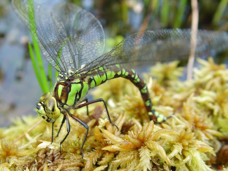 Auffällig ist das Fortpflanzungsverhalten: je nach Spezies die Tandemstellung oder das Paarungsrad. Die Eiablage geschieht im freien Abwurf, durch Einstechen in Wasserpflanzen oder Abstreifen an der Vegetation. Manche Moorlibellen sind sogar auf bestimmt Torfmoose fixiert – klar, auch ein menschlicher Gladbach-Fan geht ja nicht (freiwillig) ins Bayern-Stadion!