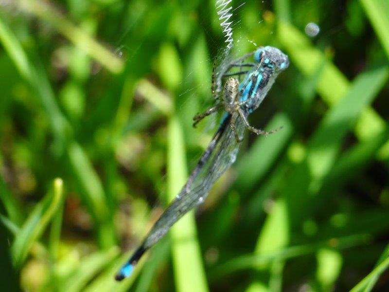 Ursprünglich nur im Mittelmeerraum beheimatet, hat sich Argiope bruennichi in den letzten Jahren im Schatten (der eigentlich übermässige Sonne war) des Klimawandels immer weiter nach Norden vorgekämpft. Mittlerweile fühlt sich die bis zu 2,5 cm große Jägerin auch im Emsdettener Venn heimisch, wo sie mit ihren bodennahen Netzen vorwiegend Springinsekten a lá Heuschrecken auflauert.